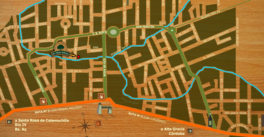 El complejo está ubicado a una cuadra y media de pleno centro y a 50 metros del arroyo El Sauce que cruza por el pueblo.